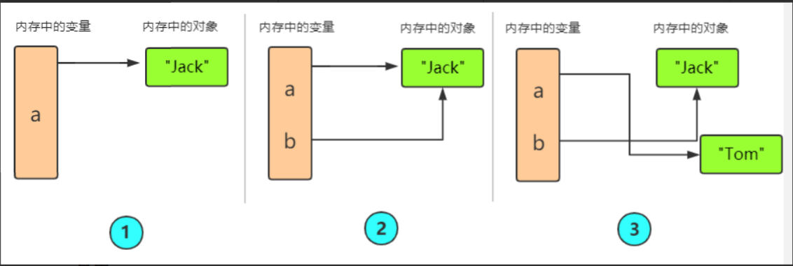 执行b = a,解释器创建变量b,并且将其指向变量a指向的字符串‘Jack’对象;