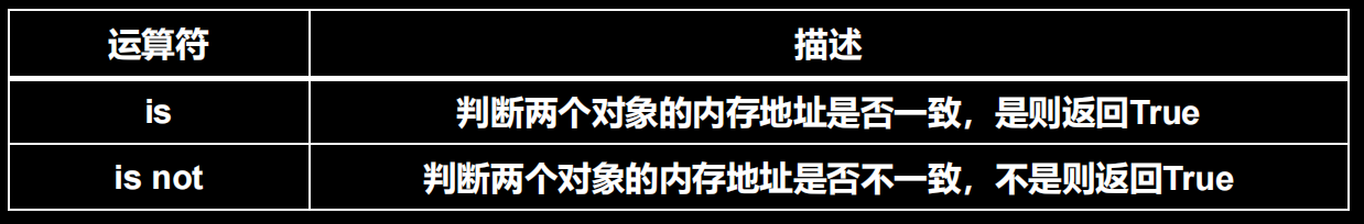 - 身份运算符也是 Python 的特色语法(全部都是小写字母)