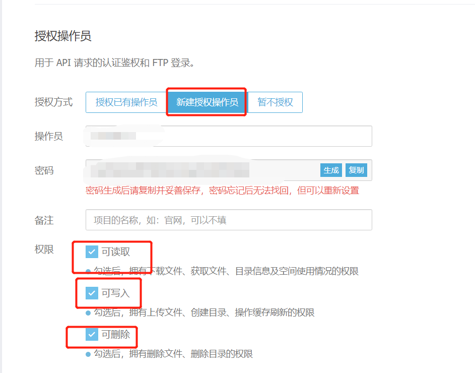 6.将操作员账号和密码保存下来,一会需要在PicGo图床上配置需要用到!(一定要记住)