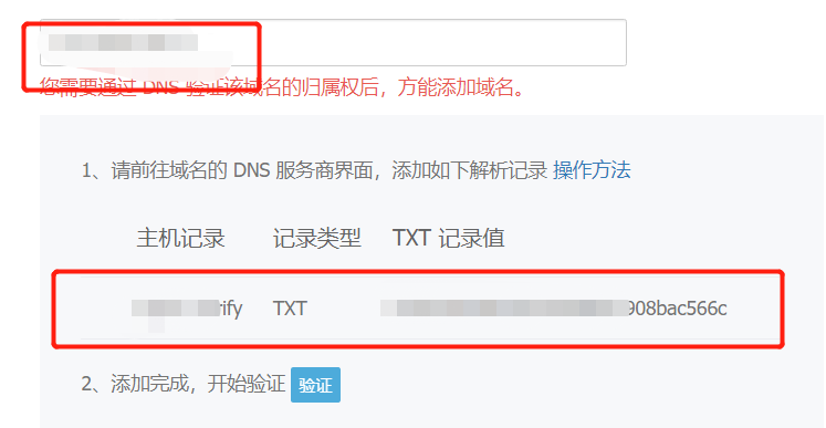 9.域名输入后会生成解析记录值(复制到你购买所域名的运营商进行解析,博主用的是华为云)