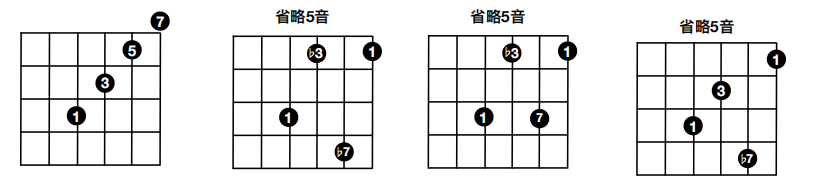 1 | 大七:根音 三音 七音 根音 五音 | [指型只能在G和弦使用] |