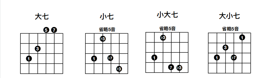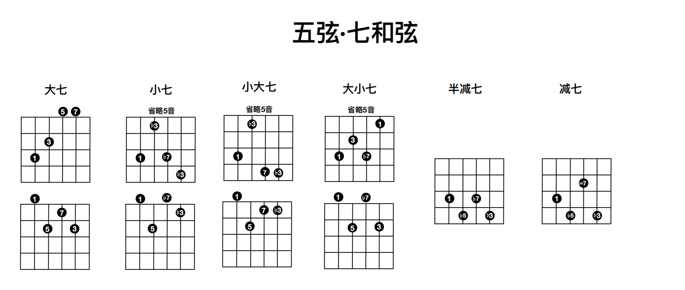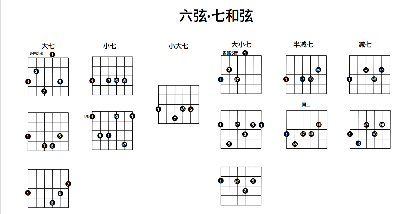 1 | 大七:根音 三音 五音 七音 三音 | 最后的三音在一弦的位置 |